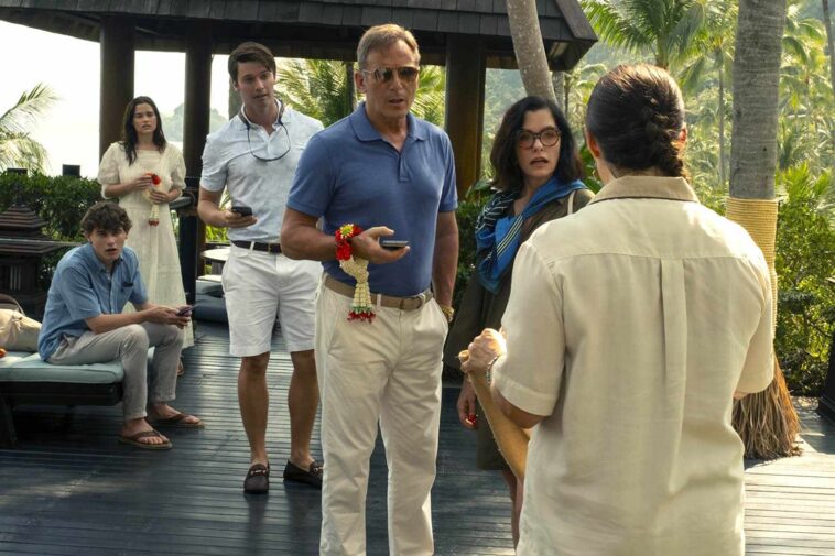 Jason Isaacs, Parker Posey, Patrick Schwarzenegger, Sarah Catherine Hook, and Sam Nivola in season 3 of ‘The White Lotus’.