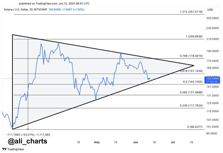 Now, here is the chart shared by the analyst that shows the Symmetrical Triangle that the 1-day price of Solana has been trading inside over the last few months: